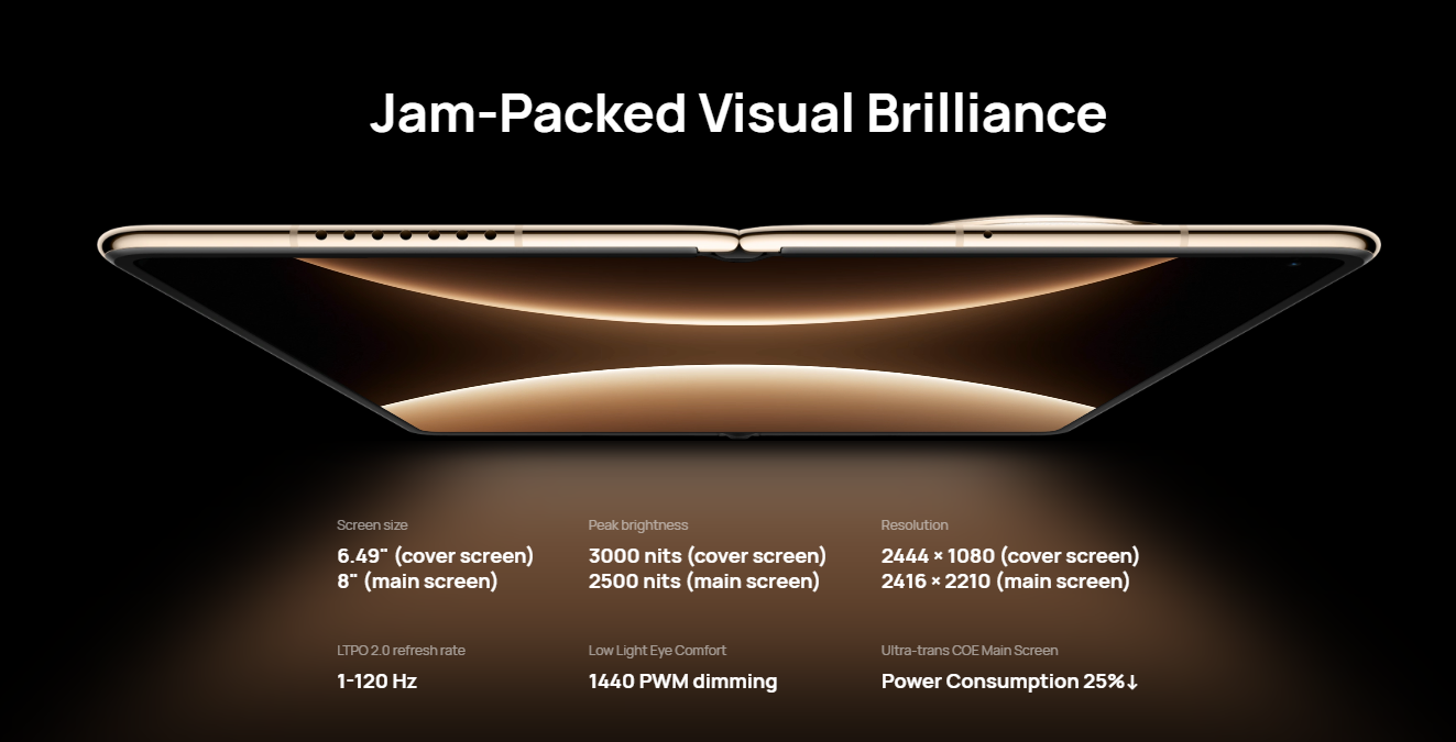 - HUAWEI X-True Display: Jam-Packed Visual Brilliance; 8-inch FullView Immersive Display when unfolded, with a crisp 2K+ resolution, 1-120Hz LTPO Adaptive Refresh Rate, and HDR Vivid certification