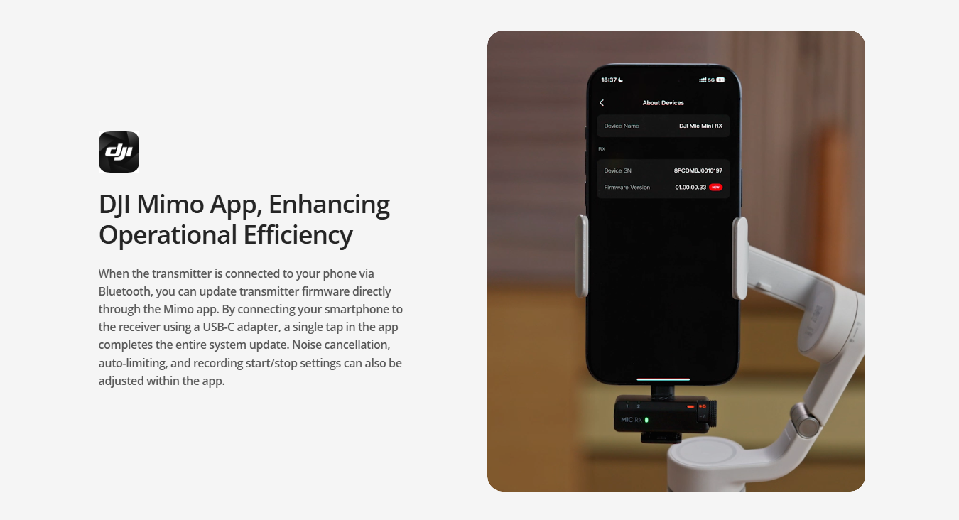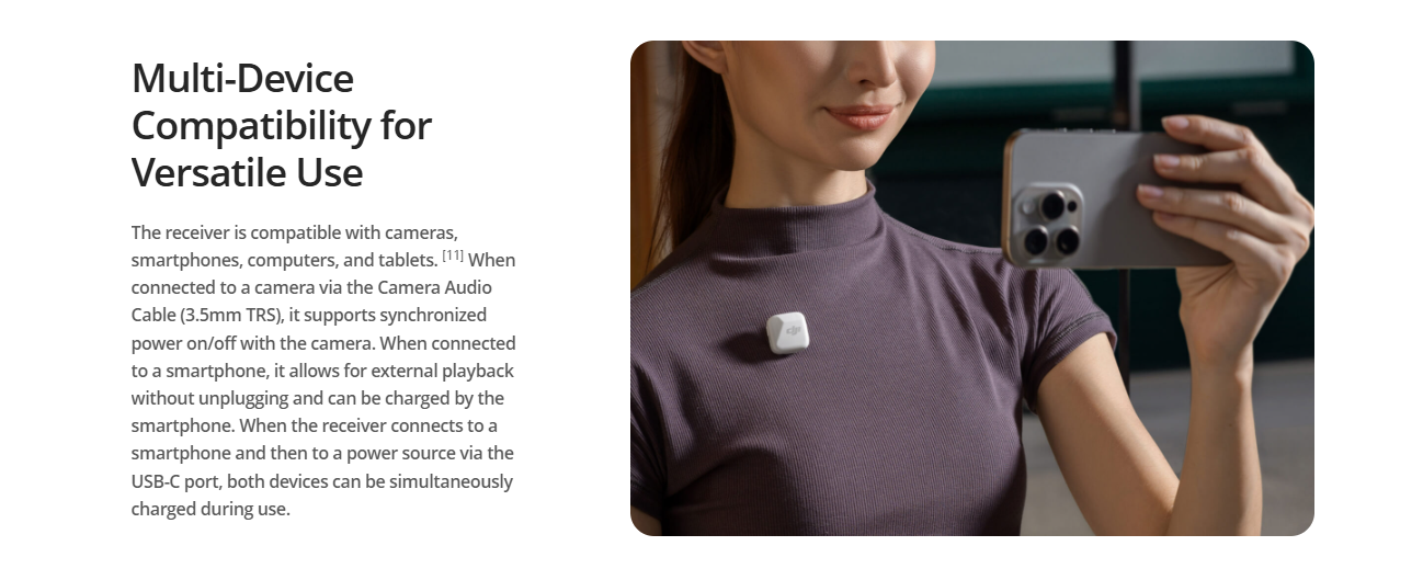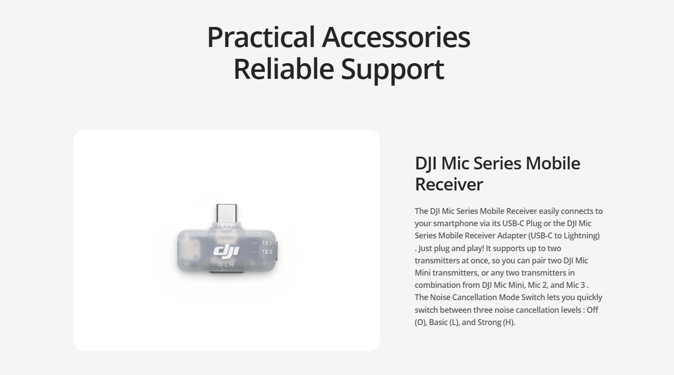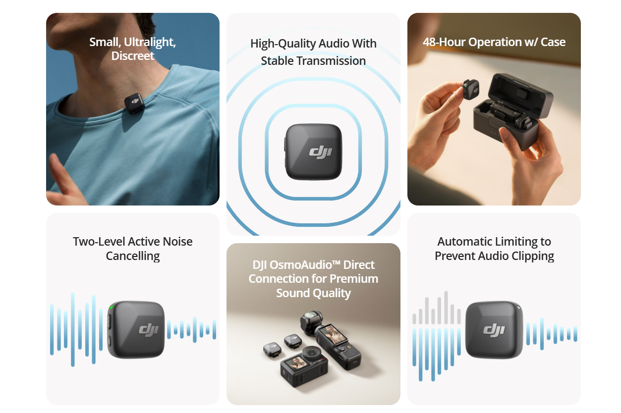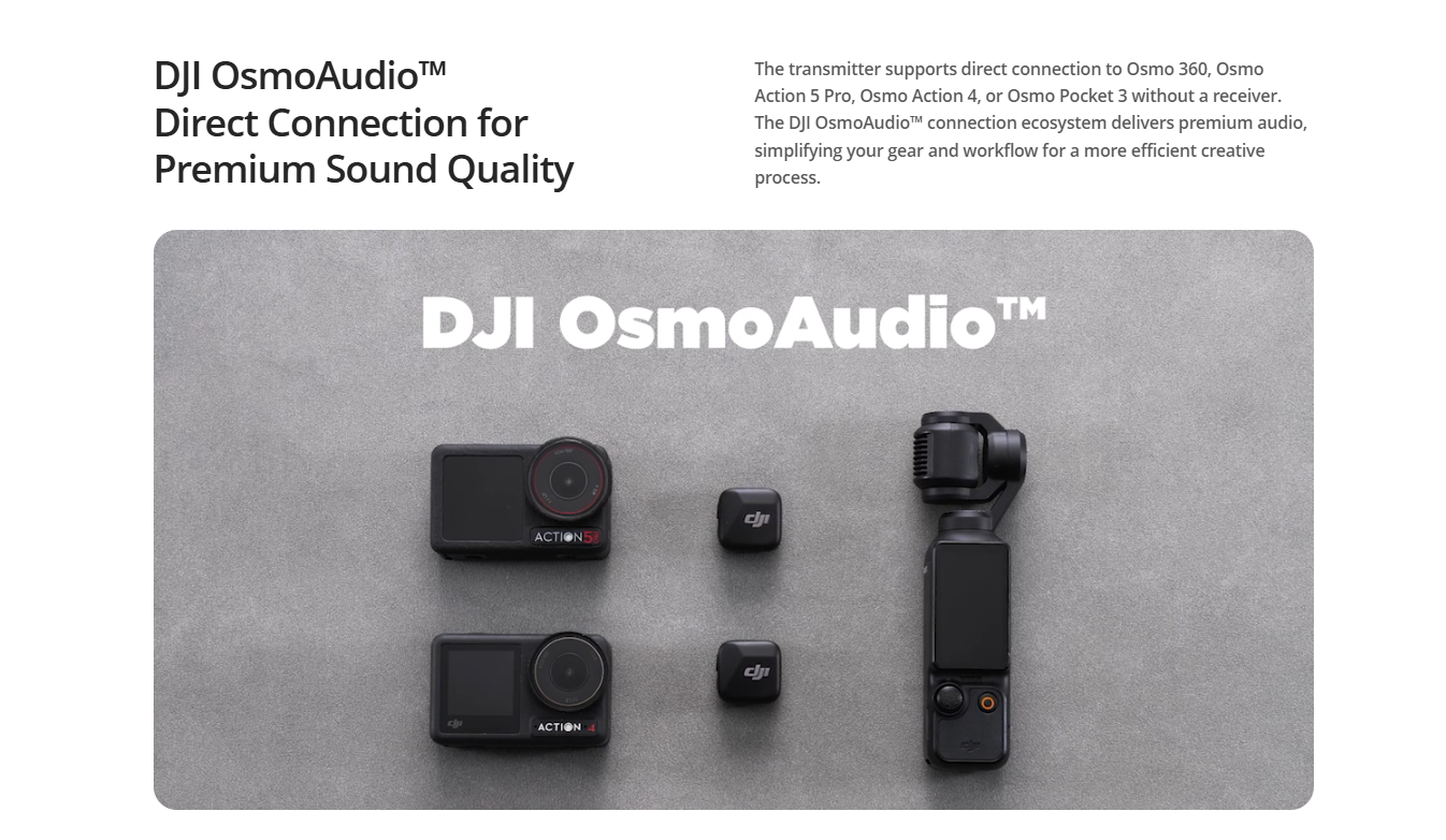 - DJI Ecosystem direct connection - With DJI OsmoAudio, a transmitter without a receiver can be connected to Osmo Action 5 Pro, Osmo Action 4 or Osmo Pocket 3, delivering first-class audio.