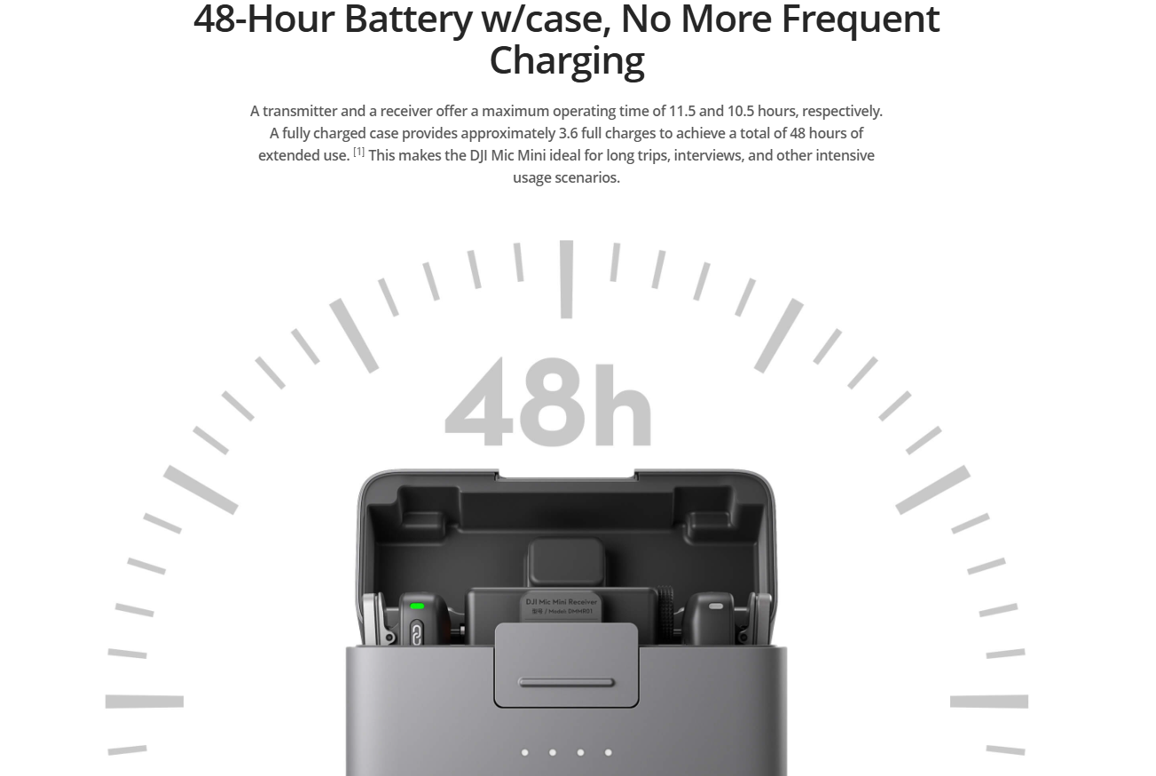 - Extended battery, more recording time - The wireless mic mini microphone with charging cradle provides up to 48 hours. Battery life, ideal for long journeys, interviews, live streaming and other intensive usage scenarios.