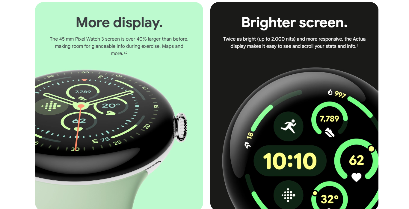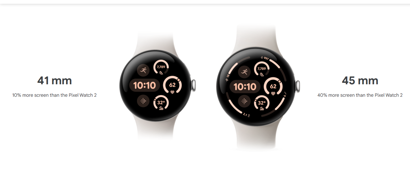- The 45 mm Pixel Watch 3 screen is over 40% larger than before, making room for richer, glanceable info during exercise, in Maps and more.