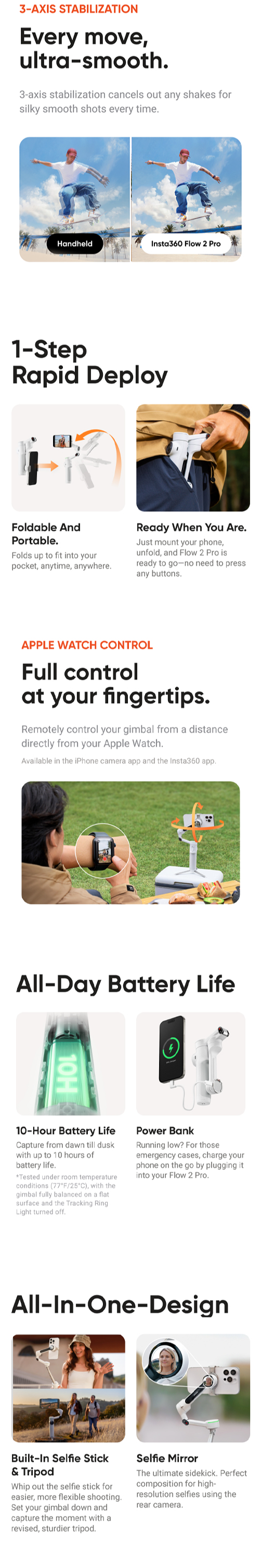 - All-in-One Content Creation Tool: All your essential tools in one AI phone gimbal. A built-in tripod for iPhone and Android shots, selfie stick, selfie mirror, teleprompter, power bank, and 10-hour battery life. With Flow 2 Pro you're all set for a full day's filming—no other gear needed.