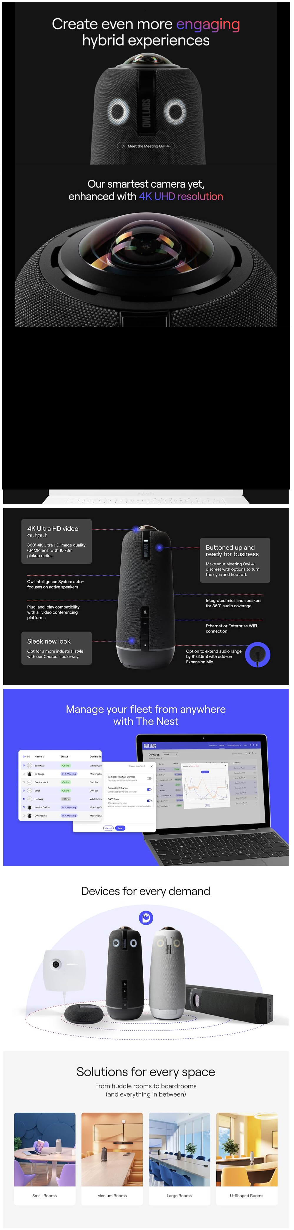- Experience truly immersive meetings with the Owl Labs Meeting Owl 4+, a 360° 4K smart video conference camera with built-in microphone and speaker.