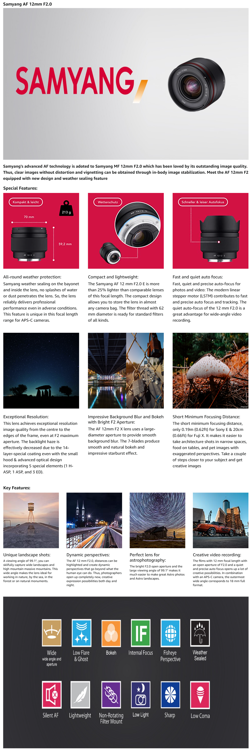 The Samyang 12mm f/2.0 AF is a compact ultra wide-angle autofocus lens designed for FUJIFILM X-mount mirrorless cameras. With a bright f/2.0 aperture and fast, accurate autofocus, it is perfect for landscapes, astrophotography, travel, and wide-angle video.